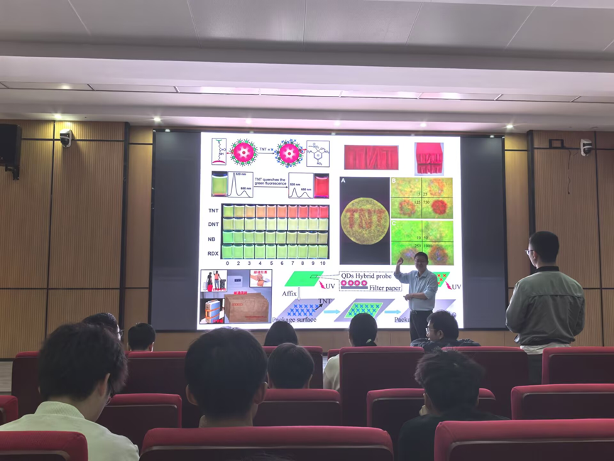 张奎教授指出,在公共安全事件频发、治理任务艰巨的背景下,更需要发挥党建引领作用,将党的先进理念融入科研实践,以现代科技提升社会治理效能。他围绕芳香硝基爆炸物、有机磷神经毒剂、放射性核素等危险物质的现场快速探测需求,介绍了新型光学传感材料的研发、基于比率荧光信号输出的可视化检测方法构建,以及可视化探测传感器的成功研制,实现了危险物质的现场快速可视化筛查,充分展现了党建与科研深度融合,以科技创新服务国家公共安全战略需求的实践成果。