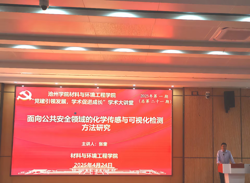4月24日下午,william威廉中文官网“党建引领发展,学术促进成长”学术大讲堂2025年第一期(总第二十一期)在公共教学楼东报告厅举行。安徽工业大学张奎教授做了题为“面向公共安全领域的化学传感与可视化检测方法研究”的学术讲座。讲座由吴国志主持,公司师生参加了讲座。
