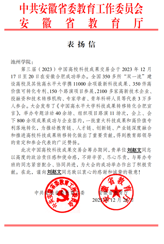 刘赵文同志在此次大会筹办期间,以高度的政治责任感和使命感,与筹办专班的同志紧密配合、协同共进,为大会的成功举办作出了积极贡献,省委教育工委、教育厅发来表扬信,对其工作予以高度肯定。