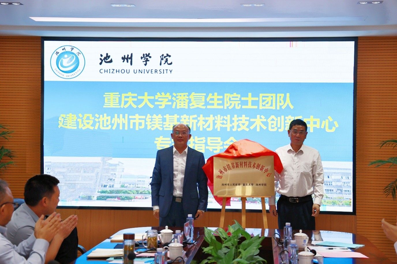 王先柱与潘复生院士共同为池州市镁基新材料技术创新中心揭牌。