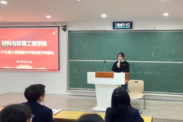 随后,21新能源材料与器件1班安紫艳同学代表全体学员从思想、学习、工作以及生活等方面如何积极向党组织靠拢做了表态发言。