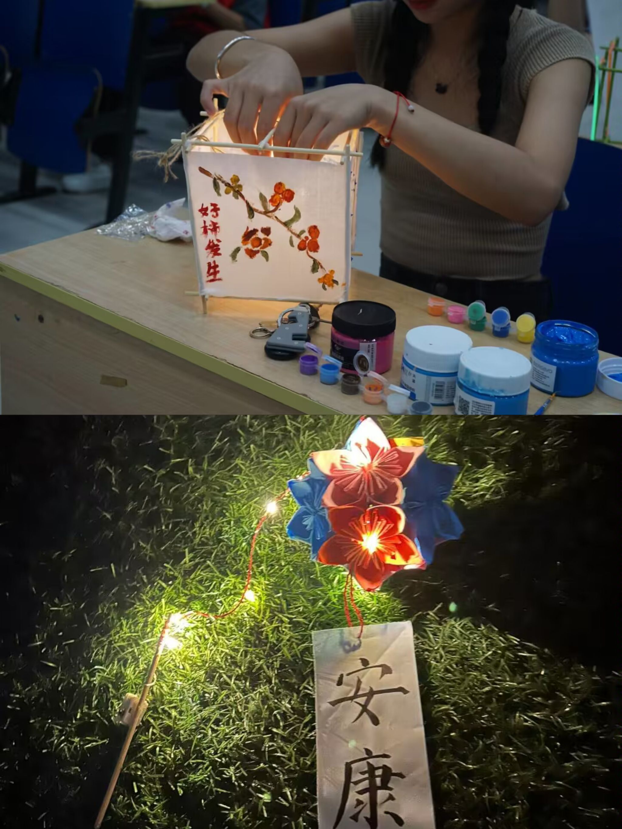 “花灯邀明月 巧手迎中秋”主题活动现场,同学们学习花灯的历史、花灯的结构以及制作过程,自行组合、齐心协力开始制作形式多样、带着美好祝愿的花灯。之后,同学们拿着各自的花灯来到操场围坐一圈,赏花灯吃月饼,并尽情展示各自的才艺,操场一片欢声笑语。“虽然离家远,无法与家人团聚,但是能感受到公司浓浓的关爱,并且学会了自己制作漂亮的花灯,今天过了一个非常有意义的中秋节”来自河南省的23级环境工程2班李姗珊同学高兴的说。