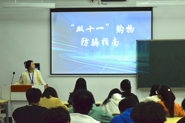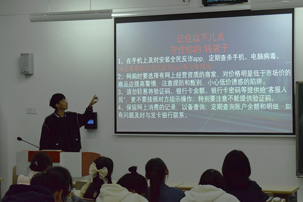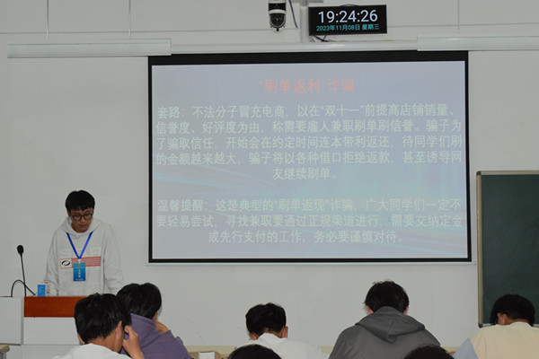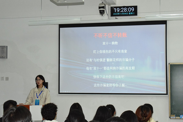11月8日下午,为提高同学们的防诈骗意识,在“双十一”购物狂欢节之前,“新心”防诈骗志愿宣讲团于11月8日下午在公共教学楼为2023级新生举行了一场“双十一”防诈骗知识宣讲。