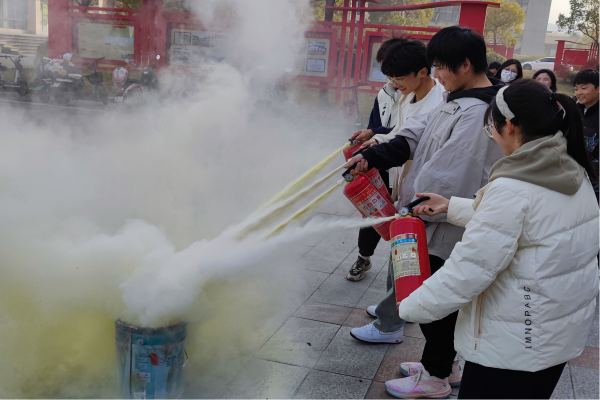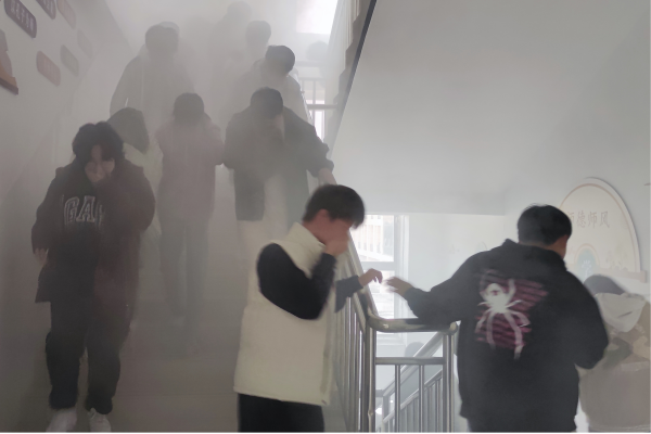 本次演练内容主要为模拟实验室发生火情,进行师生紧急疏散与应急处理。演练以烟雾报警为开始信号,楼层负责人发现楼道内烟雾弥漫、火情不可控后,立即上报并启动消防疏散预案,迅速引导楼内师生沿应急疏散安全通道快速撤离至楼外空旷场地。现场组织高效,人员疏散有序。