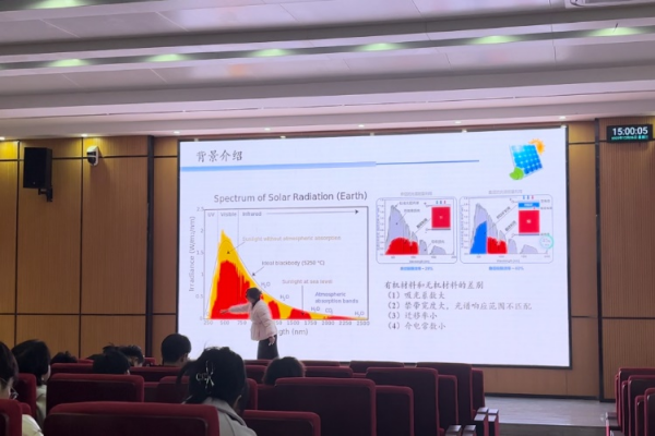 报告会上,郑楠楠老师先以身边事身边人为例为大家讲述了科学无国界但科学家有国界,在科学研究的道路上,要有信念、守护梦想、坚持奋斗,时刻谨记科技强国,我们都是国家的储备力量,要时刻保持淡泊名利,要把文章写在祖国大地上。郑楠楠老师为大家介绍了光伏技术的发展历程和有机太阳电池的工作机理以及研究的热点研究问题,并介绍了自分离技术在有机太阳电池中的应用,以小分子POF-N为例介绍了自分离的机理;随后以N2200为例介绍了第三组分在有机太阳电池中的应用。最后问答环节与同学们做了深度的交流沟通。