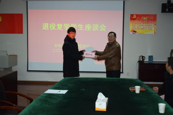 在公司退役复学员工座谈会上,汪贤才与退役复学员工代表进行亲切交流,关切询问他们在学习、生活等方面遇到的困难和问题,并送上慰问金,勉励他们永保“退伍不褪色”的军人作风。
