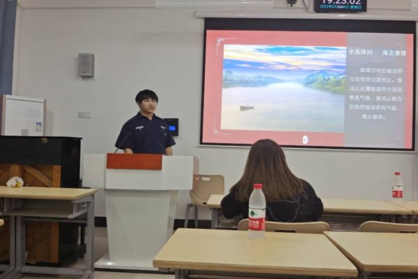 在主持人陈宇的引入下,同学们积极上台演讲,通过图文结合的形式,从衣食住行多元化、多角度绘声绘色介绍了合肥、蚌埠、池州、阜阳、六安、安庆、亳州、宿州、淮南等地文化。