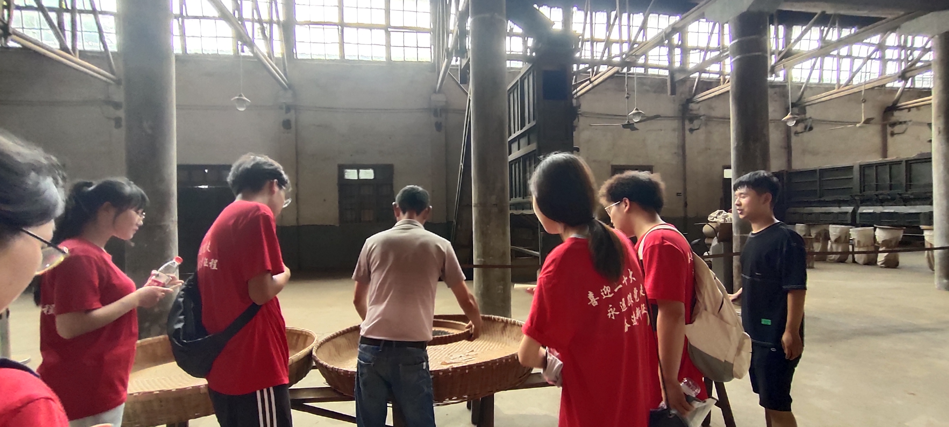 实践团首先前往安徽国润茶业有限公司进行实地调研,在调研中实践团先后参观了木质联装祁门红茶生产线,手工拣场,古老的青舍木仓等,并且在讲解员的带领下,实践团了解到各制茶机器的用途及使用方法,随后制茶车间的师傅们向团队演示了如何筛茶、选茶。