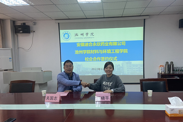 11月4日下午,安徽迪合永欣药业有限公司总经理丁晓平与公司吴国志经理共同签订专业奖学金合作协议。