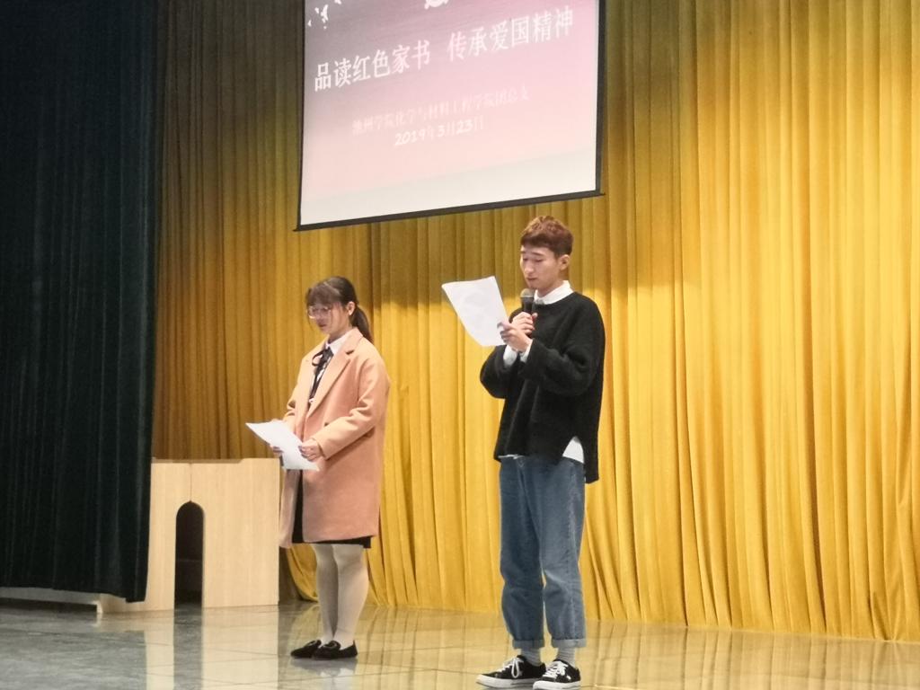 活动伊始,由主持人向大家介绍了红色家书产生的历史背景,这些红色家书,以其坚不可摧的信仰,带领大家回首那段波澜壮阔的历史。随后,两名朗读者为在场观众朗诵了红色书信——《陈觉写给妻子赵云霄的信》和《赵云霄写给女儿启明的信》。这两封用生命凝结成的文字,鲜血凝结的信,使不少观众都留下了泪水,英雄已逝,却给后来人以无尽的力量。家书诵读后,同学们表演了《军体拳》,舞蹈《礼仪之邦》,合唱《强国一代有我在》尽显我华夏大国风范。