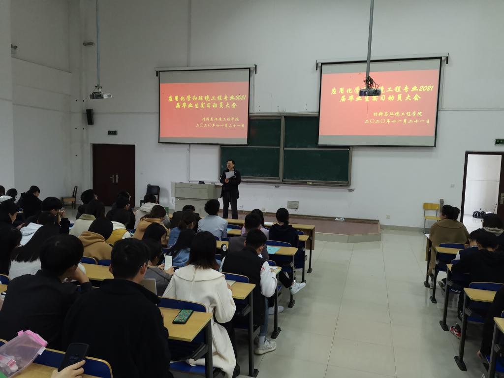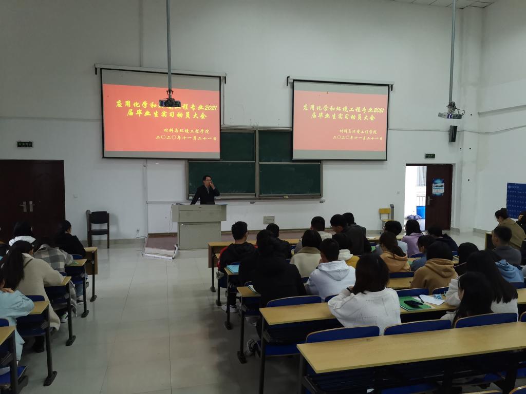 11月21日上午,公司应用化学和环境工程专业在逸夫楼阶梯教室举行了毕业实习动员大会,动员会由应用化学教研室主任刘天宝主持,副经理陈建兵、环境工程专业教研室主任贾莉、各班辅导员、实习指导老师和2021届应用化学和环境工程专业毕业班全体员工参加活动。
