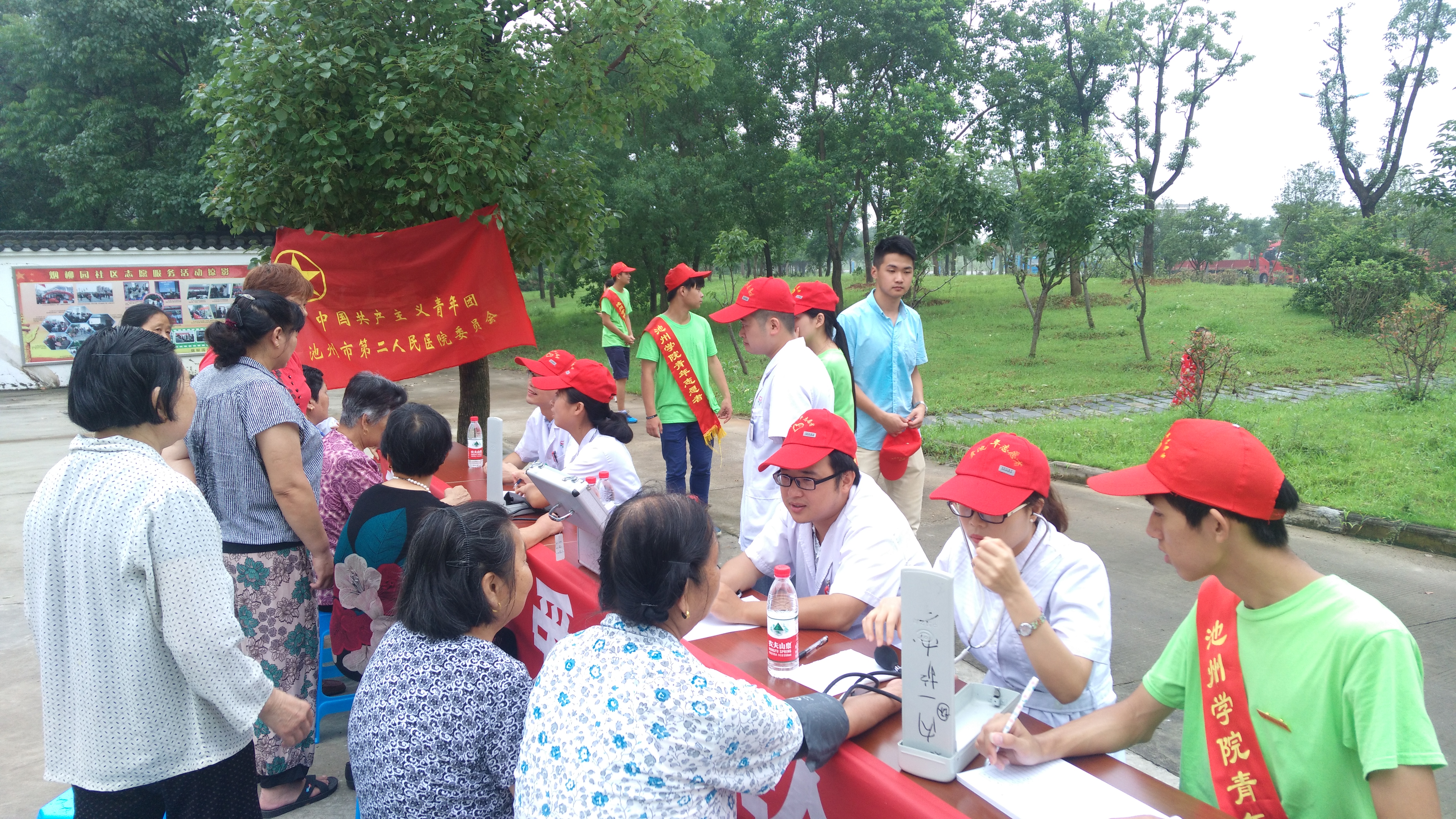 7月7日上午,志愿服务实践团联合市二院在池州市烟柳园社区开展了主题为“关爱基层群众,义诊走进社区”免费健康义诊活动,为活动不便的老年居民送去健康服务。此次活动取得较好反响,池州市新闻网及贵池区文明网为此活动进行了专项报道。(市新闻网报道:http://www.chiznews.com/news/zhxwNews/2016/710/16710145127J99H1B63KDI1I904J214.html区文明网报道:http://d.ahwmw.cn/chizhou/guichiqu/?m=article&a=show&id=324705)