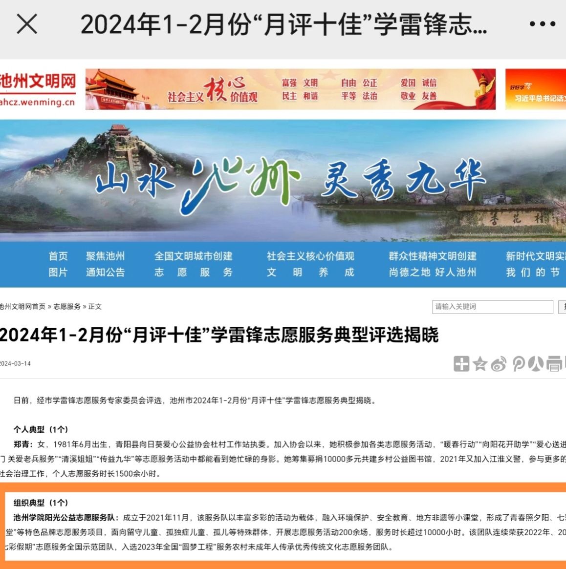 日前,经市学雷锋志愿服务专家委员会评选,池州市2024年1-2月份“月评十佳”学雷锋志愿服务典型揭晓。公司阳光公益志愿服务队入选组织典型。