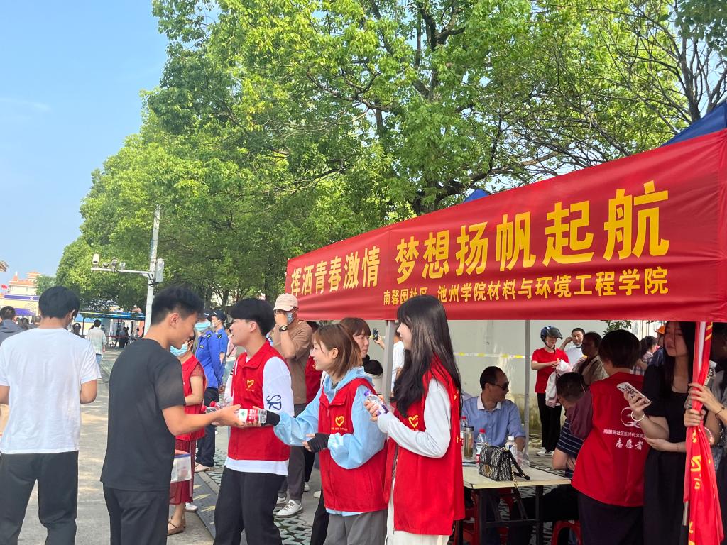 志愿者们早早来到考点,和社区工作人员一起开始搭建志愿者服务帐篷,搬上矿泉水和医疗箱。志愿者们在考场外热情地为每一位考生递上矿泉水,送去微笑和鼓励,缓解考生紧张的情绪;部分志愿者劝导行人和车辆文明有序,遵守交通规则,为高考考生出行“保驾护航”,部分志愿者在行政执法人员的带领下,前往南馨园社区进行优化高考考试环境、维护考试秩序的宣传。