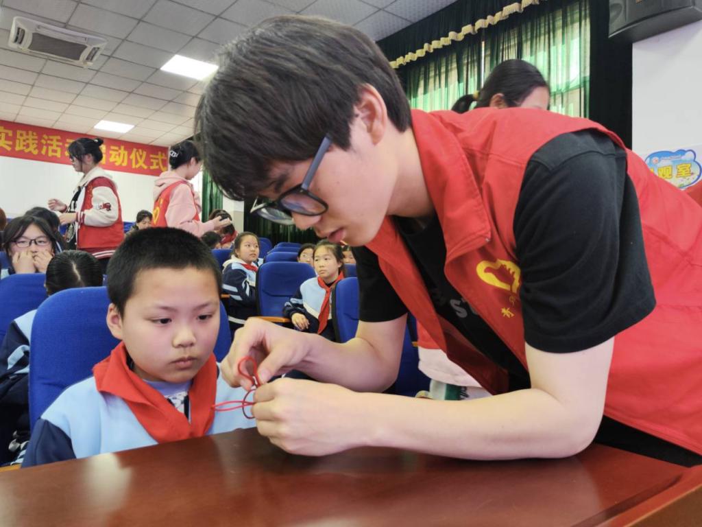 活动现场,志愿者通过ppt演示的方式带领同学们了解中国结的起源,认识中国结的文化底蕴。活动最后,志愿者们教小朋友们用红绳编制基础中国结之一—万字结,带领小朋友们进行一场“沉浸式传统文化之旅”,小朋友们仔细观察,认真模仿,感受传统编织艺术的美。