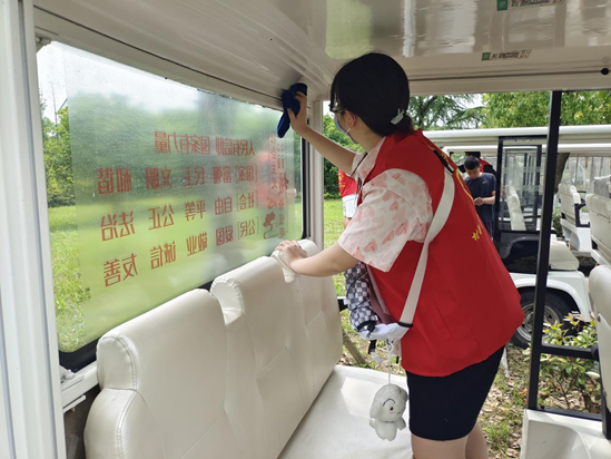 志愿者们提前打好水,带着清洁工具来到校车停放点,撸起袖子投入到擦车工作中。志愿者们拧干抹布,卷起车帘,细心擦拭座椅和车身,不放过任何一个卫生死角,并对车内进行了彻底消毒。在大家共同努力下校车的面貌焕然一新,擦车工作结束后志愿者们又将车辆旁的垃圾清扫干净。