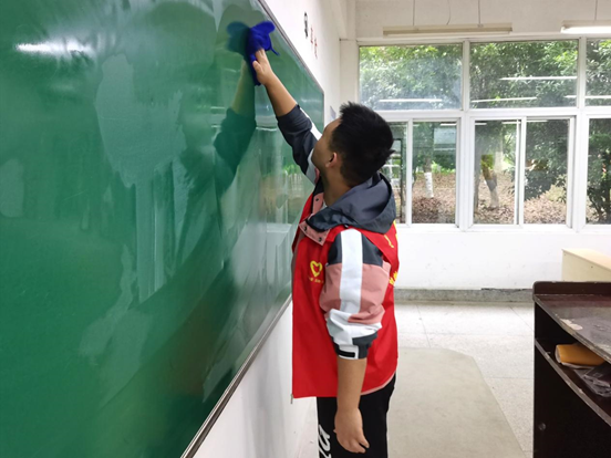 同学们来到多个教学楼,对教室地面、讲台、黑板、走廊等公共卫生区域进行了细致的清扫;清除课桌内的遗留杂物,并在打扫完成后对垃圾进行了集中分类处理;黑板上的污渍无法擦干净,同学们用清洗剂进行了清洗,力求清洁彻底;除菌组的同学背着消毒剂对各个角落进行喷洒消毒。在同学们的辛勤付出下,教室面貌恍然一新。