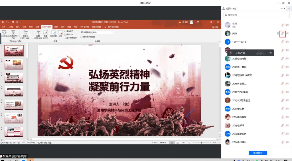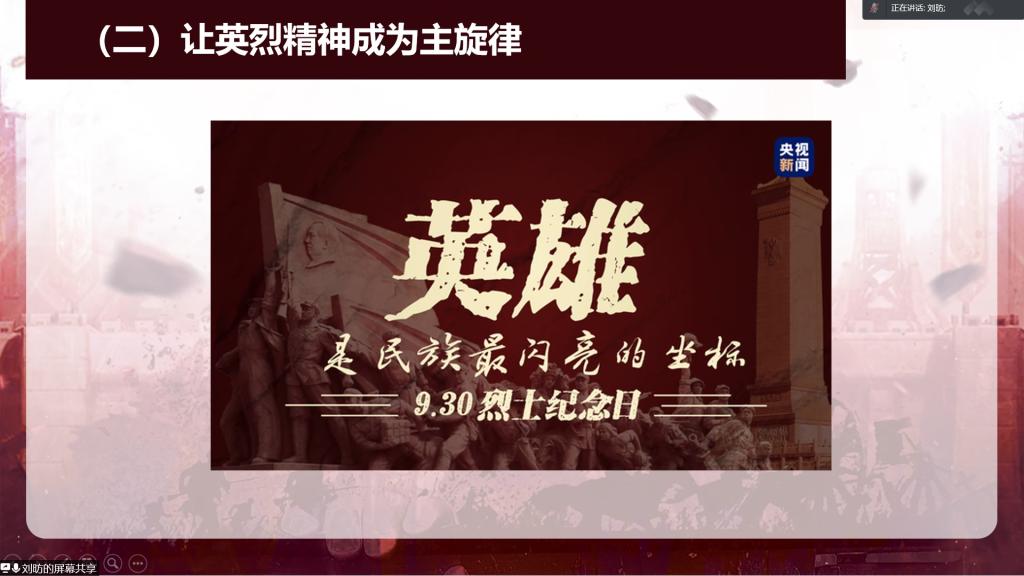 刘昉声情并茂地讲述着列举的英雄人物为理想拼搏、为信念奋斗的伟大事迹。引导同学们思考当代青年人的奉献精神,面对当前疫情,同学们能否冲锋上前、服从大局。勉励同学们要热爱党、热爱祖国、热爱人民、让红色基因和革命薪火代代传承。指出要时刻警惕历史虚无主义的肆意侵害,维护《英雄烈士保护法》权威,对一切损害英雄烈士的行为做坚决的斗争。组织同学们互相讨论、分享心得体会,大家积极参与,收获良多。