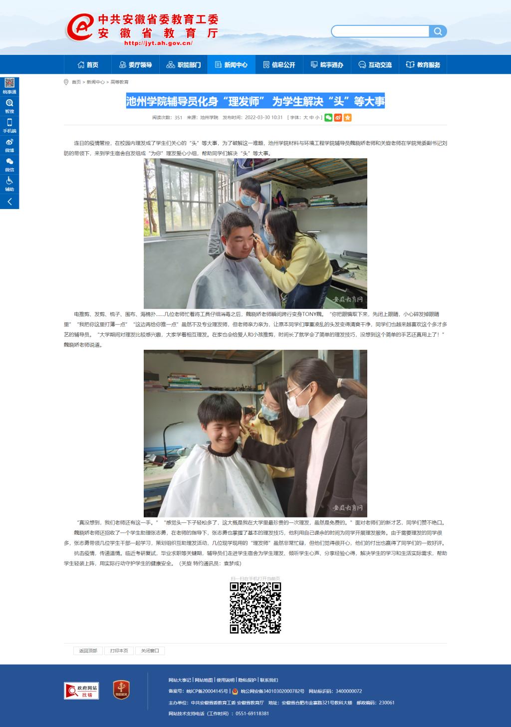 3月30日,安徽教育网以《WilliamHill中文官方网站辅导员化身“理发师” 为员工解决“头”等大事》为题,对公司辅导员走进员工宿舍为员工理发进行报道。