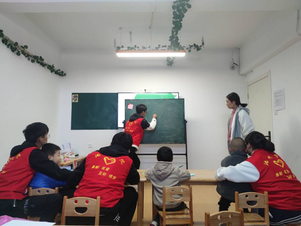 活动开始,负责人通过短片向志愿者们简单介绍了自闭症儿童的特点,并和志愿者们进行了问答讨论,强调了教学过程中的注意事项,提高了教学效率,便于后续活动的开展。随后,志愿者们被依次分配,担任每个孩子的影子老师,辅助主课老师的教学任务。在志愿者们的引导下,孩子们独立完成了绘画,学习了“小老鼠上灯台”的手势舞,在过程中,志愿者们时而用手掌轻轻拍孩子的肩膀给予鼓励,激励孩子们的成长。最后,志愿者们和负责人合影留念,此次活动圆满成功。