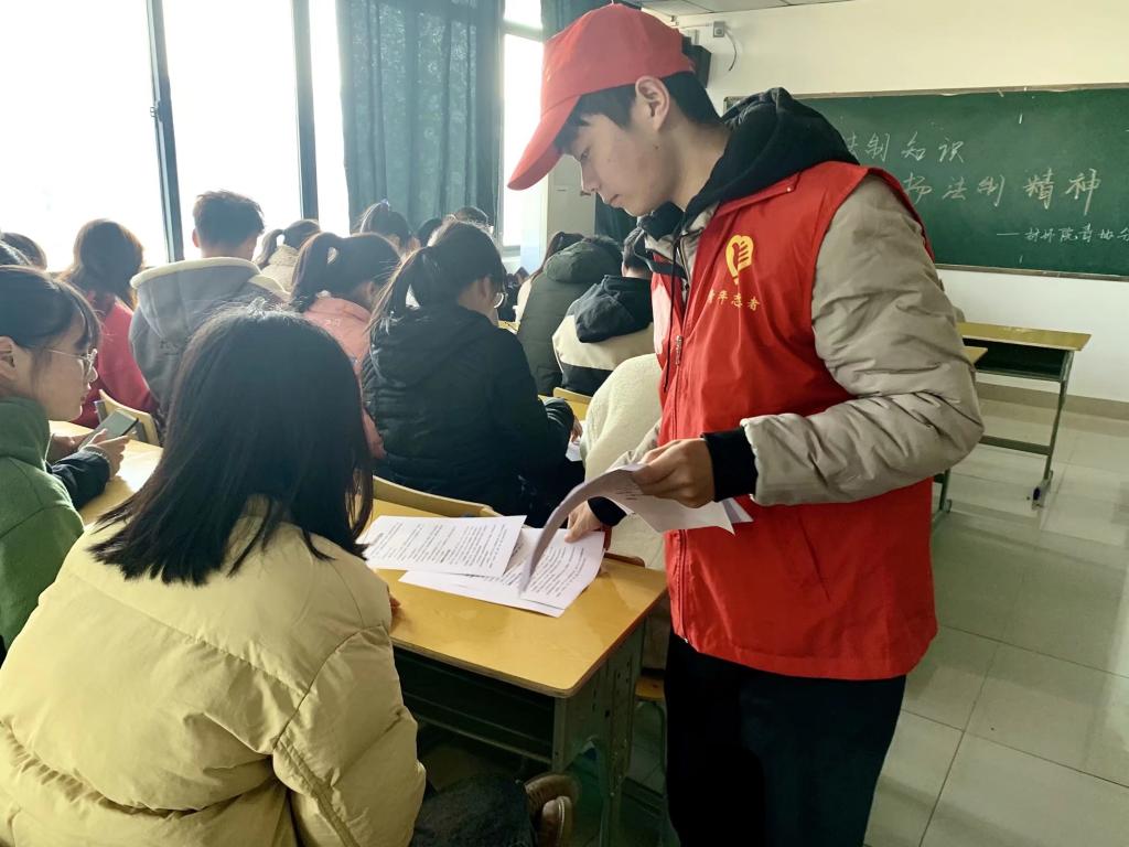 志愿者们先发放法调查问卷给大家,以此测试大家对法治的了解程度,在此基础上,志愿者以PPT的形式向同学们展示了法治的相关知识和法治的重要性,让我们更加清楚宪法在我国政治、经济、社会生活中的重要地位;最后,志愿者们分发了准备好的法治宣传单,加深了同学们对宪法的了解,清楚了作为公民享有的基本权利和应履行的义务,懂得了要学法、知法、守法。