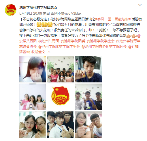活动期间,化材公司团总支新浪微博发起“春风十里,团徽与你”话题活动,各团支部进行话题接力。 5月13号,全体团学青成员于逸夫楼,录制团歌《光荣啊,中国共青团》视频,5月15日晚,公司在逸夫楼阶梯教室举办“党建带团建,不忘初心跟党走”座谈会,并同步发起网络视频直播。座谈会由佘春莹主持,预备党员何小玲,王红,汪萍萍,优秀团员干部刘凯丽,凌艳,张敏从各个方面为团员们讲解“不忘初心跟党走”。
